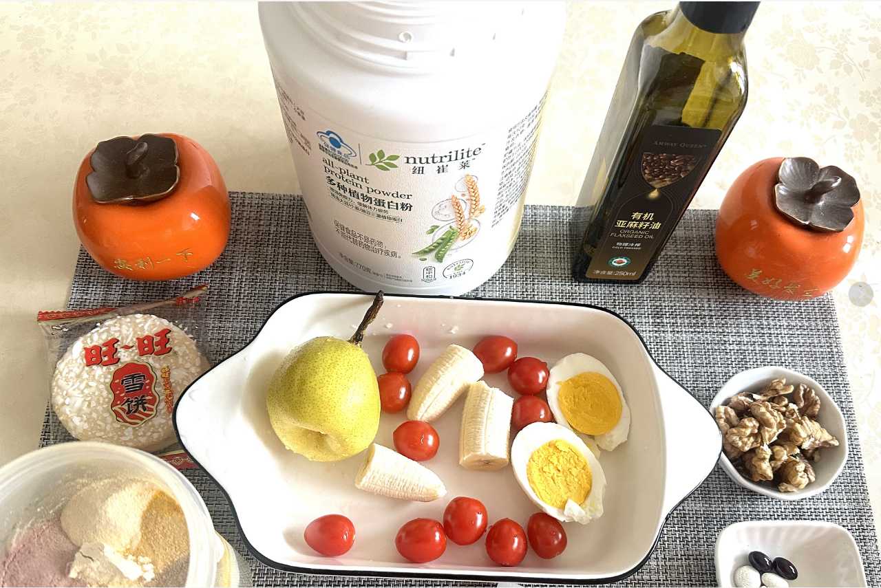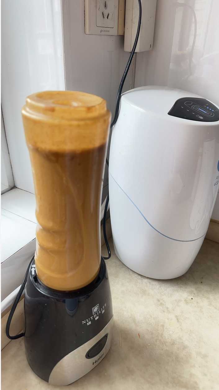 下面是他的营养早餐,她把这些食物放到料理机里打碎,变成汁然后喝下